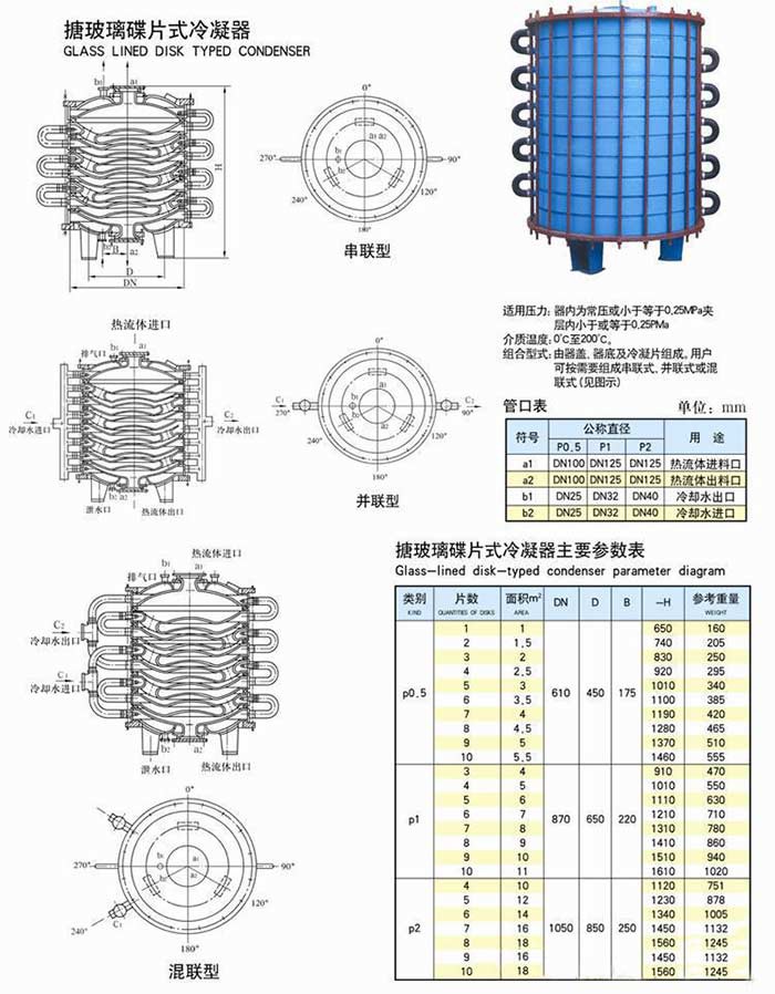 搪玻璃蝶片式冷凝器是將含硅量高的瓷釉涂于金屬表面,通過950℃搪燒,使瓷釉密著于金屬鐵胎表面制成。因此,它具有類似玻璃的化學(xué)穩(wěn)定性和金屬強(qiáng)度的雙重優(yōu)點。